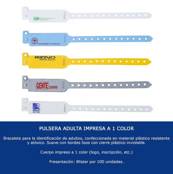 Contamos con servicios de impresión serigráfica a 1 color para pulseras plásticas, ideal para sanatorios, centros médicos, eventos, etc.